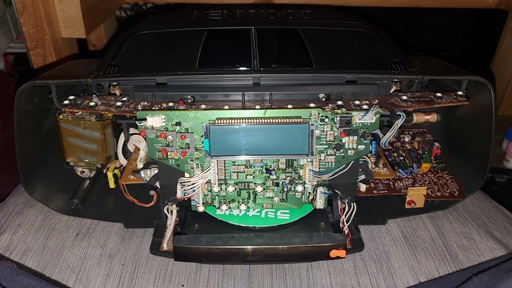 構成としては、下側にCD部、上側にカセット部とコントローラー、右側にチューナー、左側に電源があります。
