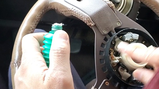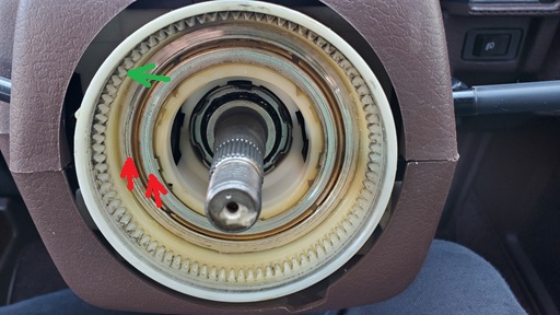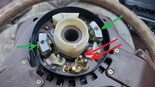 ステアリングホイールを取り外すと、電極が2本(上写真赤矢印)とギア(上写真緑矢印)が見えます。