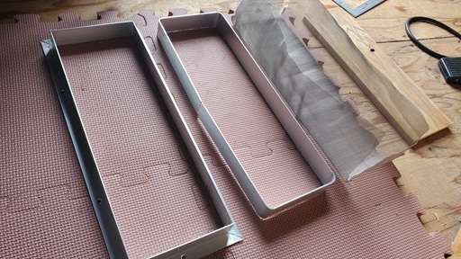 内側にフラットバーで枠を作り、外側のL字アングルで作った枠との間にアミを挟みこみます。