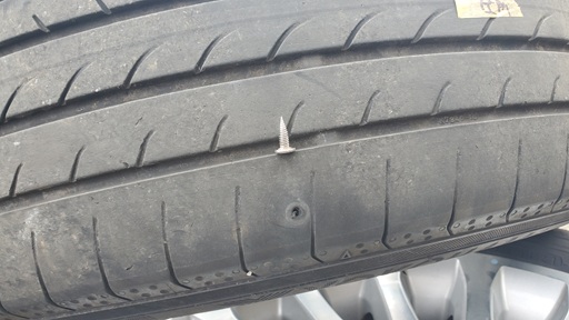 冬タイヤから夏タイヤに交換してたら、ステージアの夏タイヤがクギを踏んでいる事に気が付きました…。