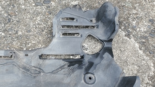 エンジンルームのアンダーパネルを取り外してみると、オイルが漏れた跡がありました。