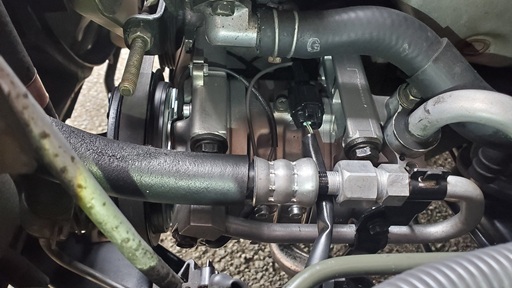 調べてみると、高圧ゴムホースがコンプレッサーにつながる所のOリングからガスが吹き出してしまったぽいです。